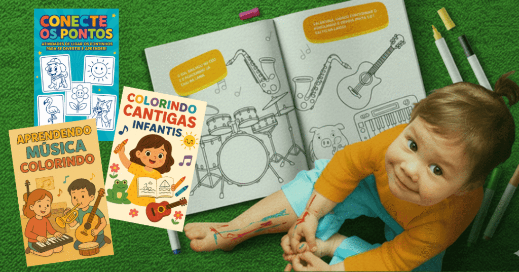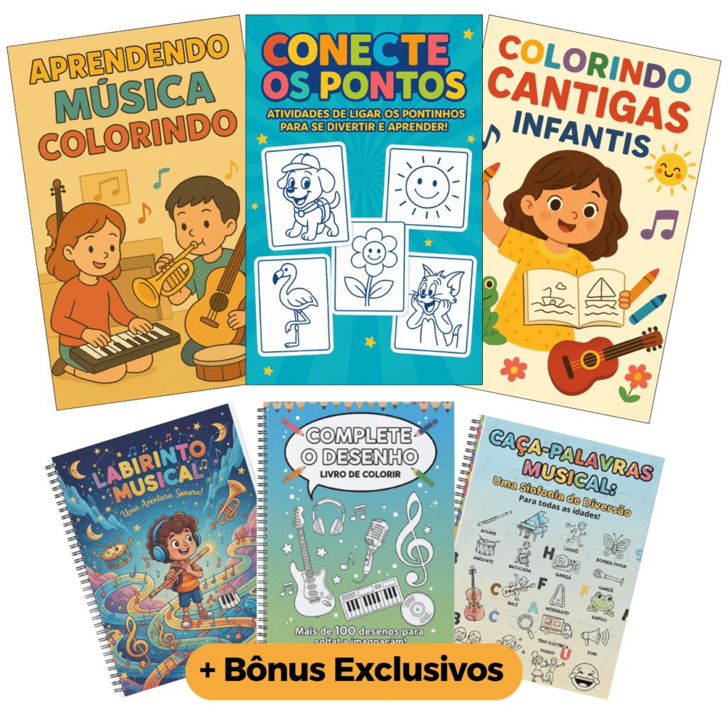 Transforme os momentos do seu pequeno em uma experiência artística inesquecível: mais de 200 DESENHOS em versão infantil para colorir e aprender o universo musical com instrumentos e cantigas infantis.