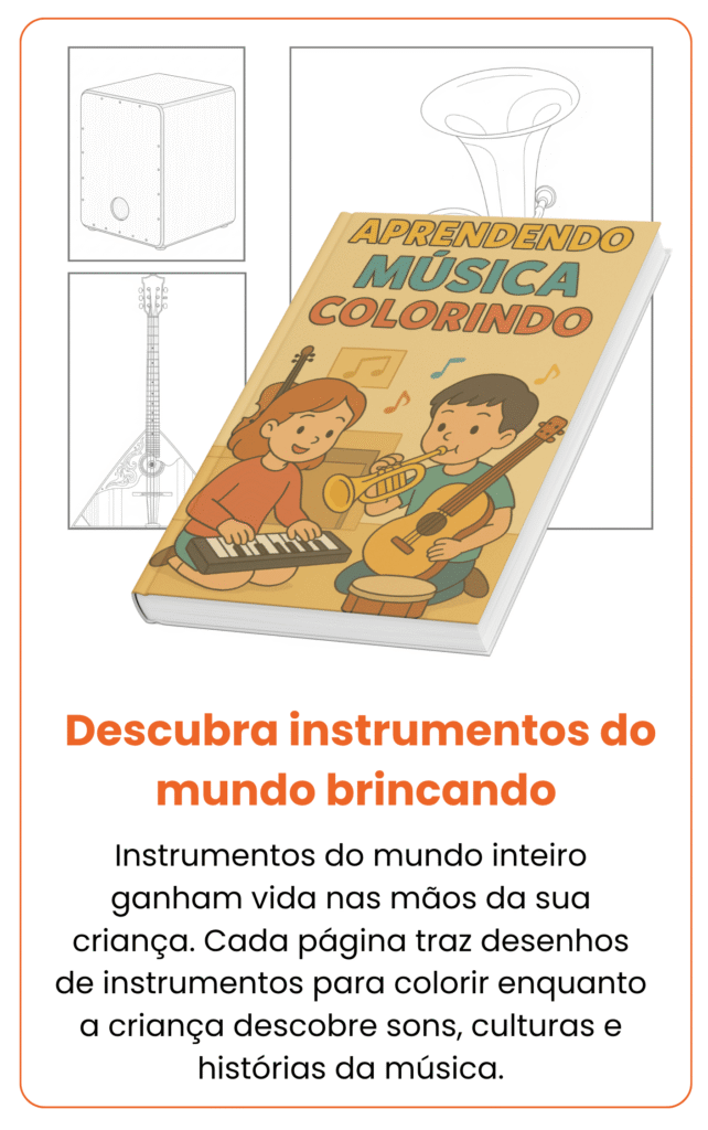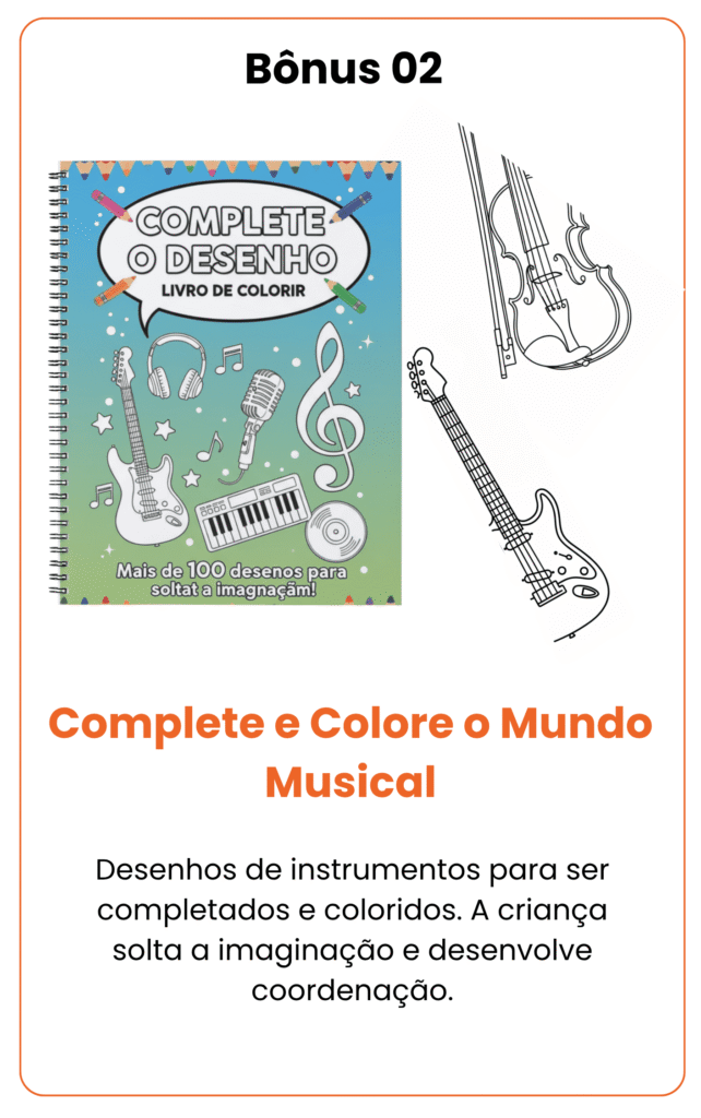 Transforme os momentos do seu pequeno em uma experiência artística inesquecível: mais de 200 DESENHOS em versão infantil para colorir e aprender o universo musical com instrumentos e cantigas infantis.